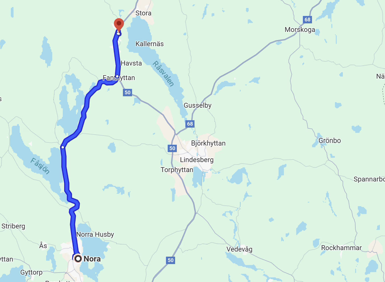 - Sträcka: ca 3 mil mellan Nora och Guldsmedshyttan